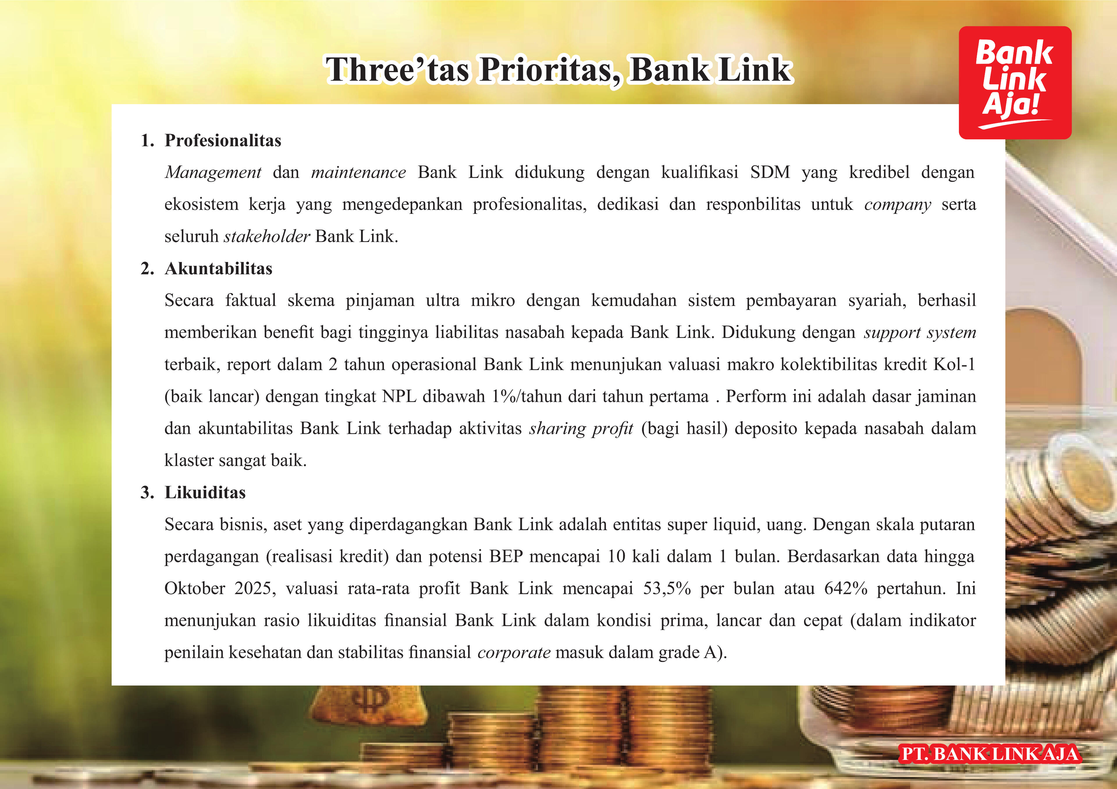Jaminan bisnis disepanjang sejarah manusia dengan sistem minor risk dan big profit. Selain itu, Bank Link legal dengan NIB PT No. 0711250070447